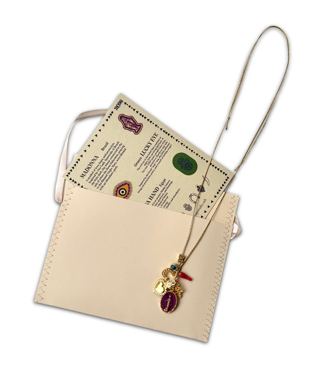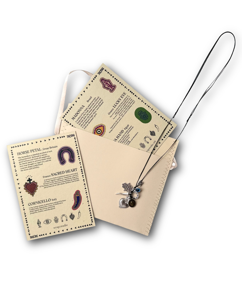 Inspired by traditions from around the world — Madonna from Brazil, Lucky Eye from Greece, Hamsa Hand from Egypt, Horseshoe from Great Britain, Sacred Heart from France, and Cornicello from Italy.